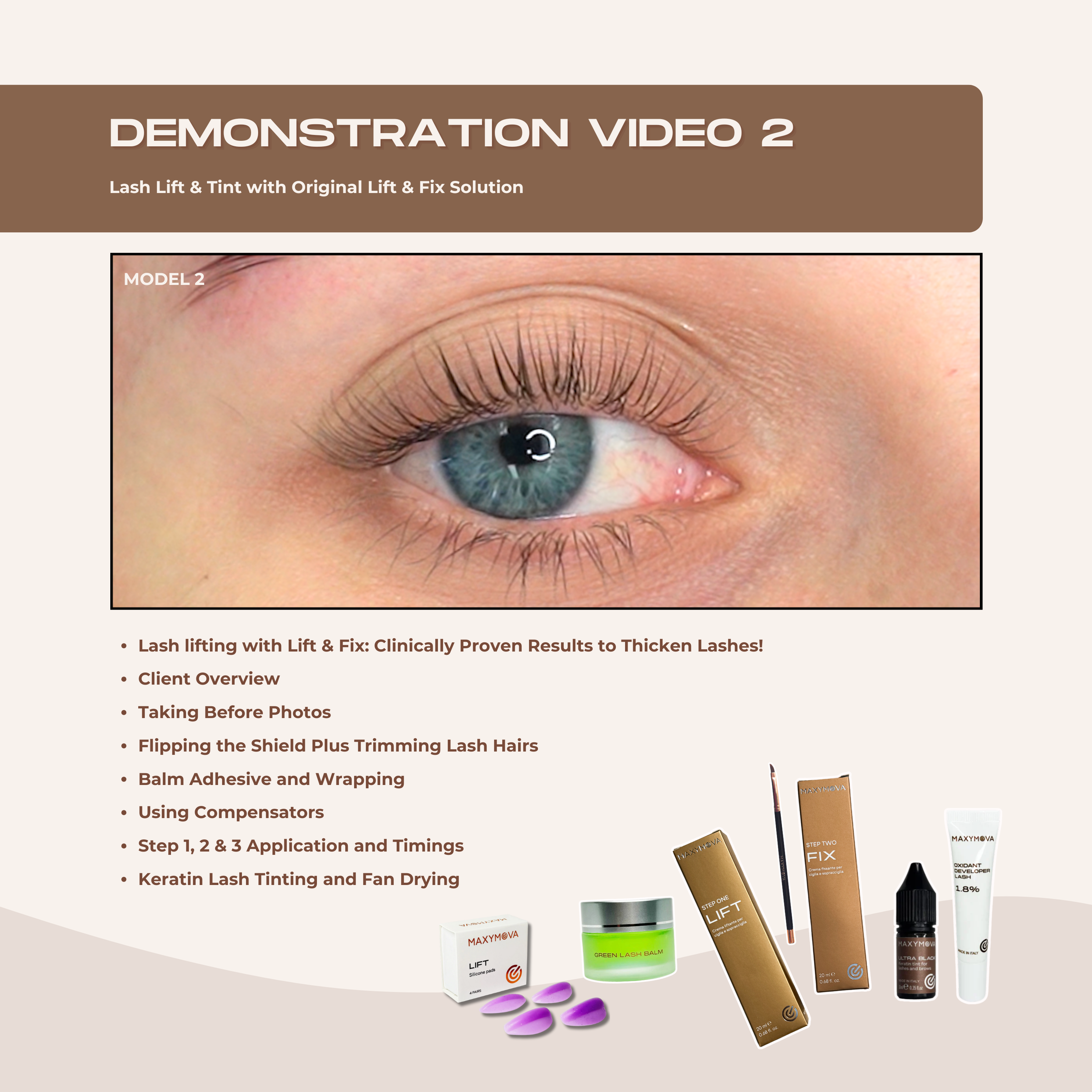 Lash lifting with Lift & Fix: Clinically Proven Results to Thicken Lashes! Client Overview, Taking Before Photos, Flipping the Shield Plus Trimming Lash Hairs, Balm Adhesive and Wrapping, Using Compensators, Step 1, 2 & 3 Application and Timings, Keratin Lash Tinting and Fan Drying